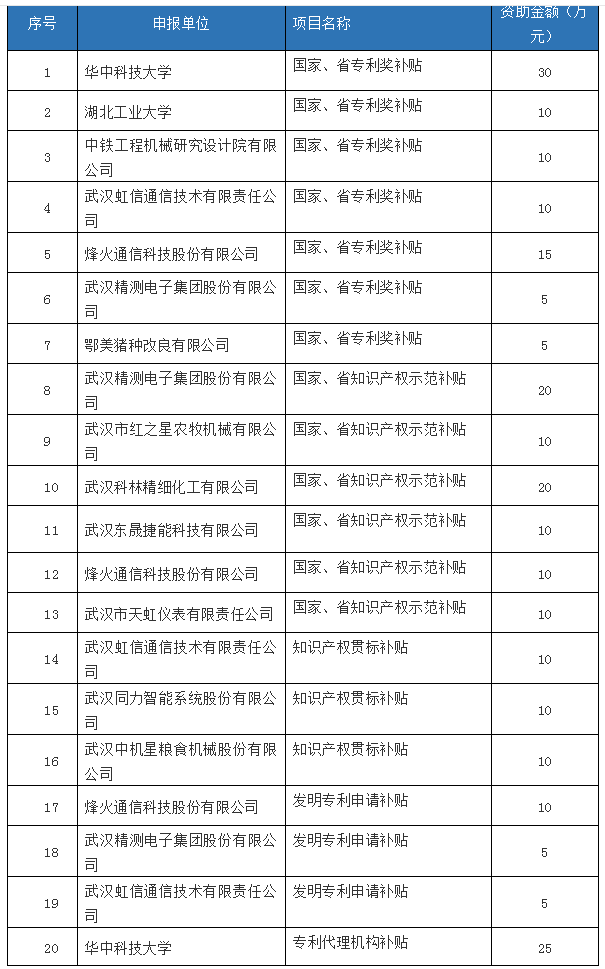本次資金撥付對象為獲得洪山區(qū)2018年度洪山區(qū)知識產(chǎn)權項目資金的企業(yè),名單及資助金額見附件。