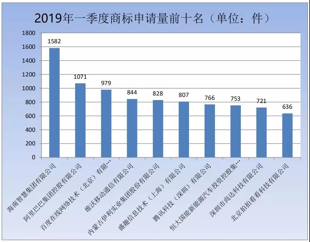 (四)打擊非正常商標(biāo)申請(qǐng)行為成效顯著。與 2018 年一季度相比,打擊商標(biāo)囤積行為成效顯著。主要表現(xiàn):一是前 10 名申請(qǐng)人總申請(qǐng)量下降。2019 年一季度國內(nèi)商標(biāo)申請(qǐng)量前十名申請(qǐng)人共申請(qǐng)商標(biāo) 8987 件,同比下降 58.95%。二是前 10 名申請(qǐng)人大中型企業(yè)居多。2019 年一季度國內(nèi)商標(biāo)申請(qǐng)量前 10 名申請(qǐng)人半數(shù)以上是阿里巴巴、百度、維沃、伊利、騰訊、恒大等知名企業(yè),而 2018 年一季度國內(nèi)商標(biāo)申請(qǐng)量前十名申請(qǐng)人中,僅有騰訊一家知名企業(yè)。